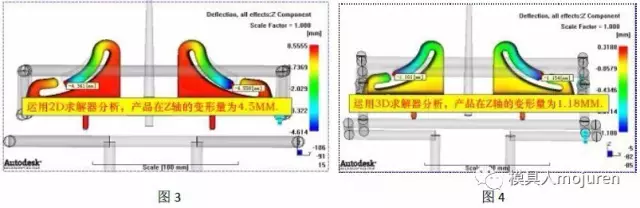 此產(chǎn)品雖有拐角,但不可使用雙層面網(wǎng)格含有拐角效應(yīng)的選項進行分析,由于此產(chǎn)品的形狀、壁厚分部不均且壁厚變化較大已不符合使用雙層面網(wǎng)格的要求(在這里我用雙層面網(wǎng)格分析了一下,如圖3所示。分析出的變形高達4.5MM),因此采用3D網(wǎng)格分析,分析出來的產(chǎn)品最大變形為1.18MM,如圖4所示。
